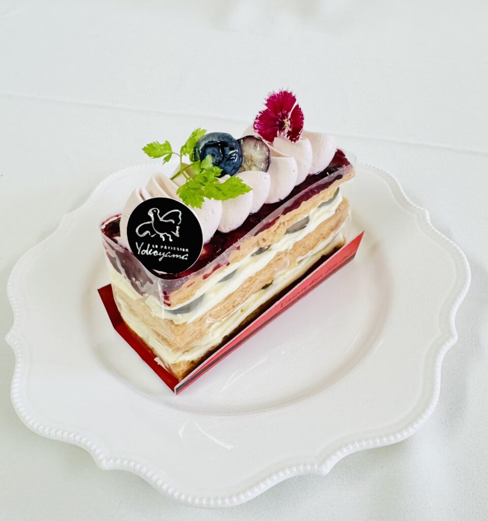 サクサクのパイ生地とダクワーズ生地に煮詰めたブルーベリーとフレッシュなブルーベリーを入れました。