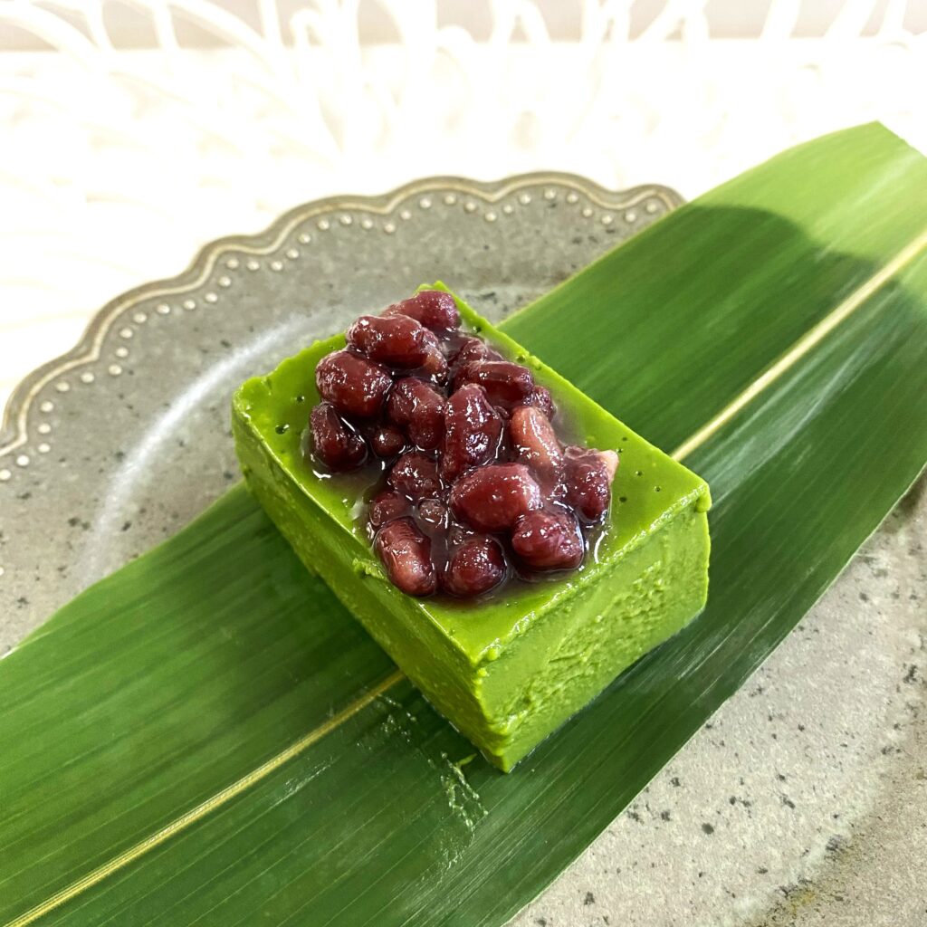 抹茶とミルクを一緒に練り込んだ口どけの良いくず練りを笹の葉で包みました。