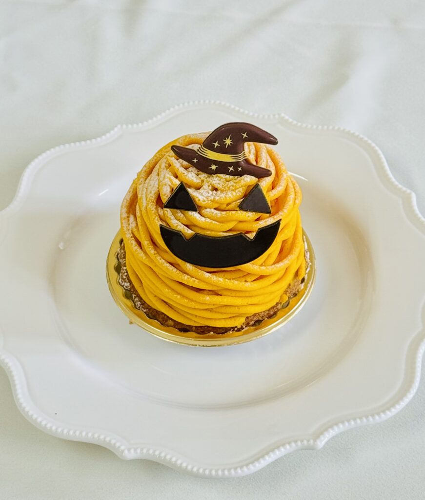 タルト生地の上に生クリーム、かぼちゃの甘露煮をのせかぼちゃのペーストを絞りました。