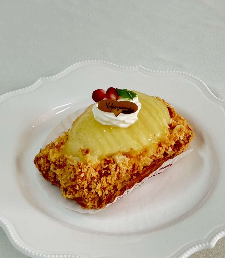 サクサクのパオ生地の上に、スポンジ生地、カスタード生地、洋梨を乗せました。